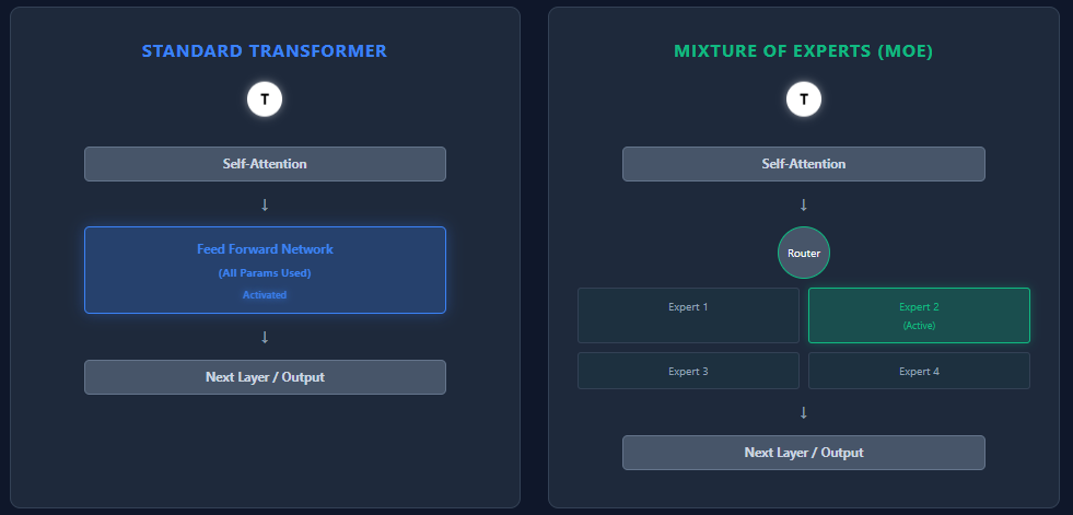 - MoE: Replaces the FFN with multiple smaller feed-forward networks, called experts. A routing network selects only a few experts (Top-K) per token, so only a small fraction of total parameters is active.